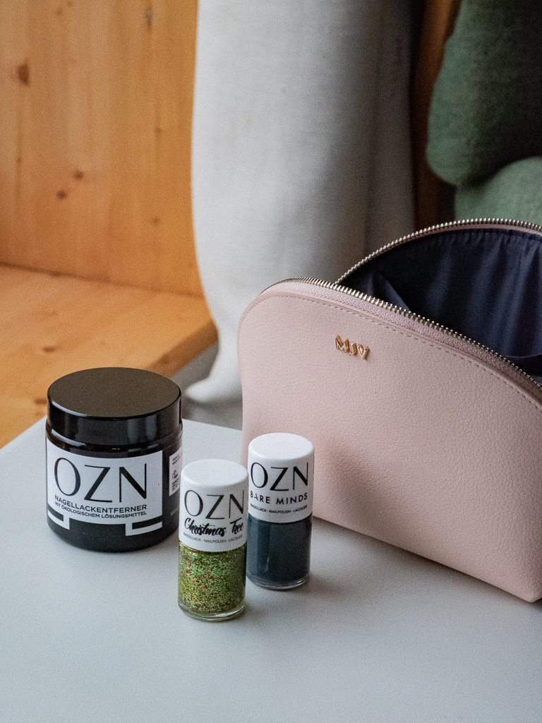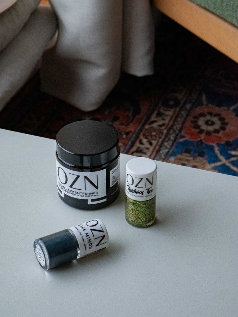 OZN ist es wichtig mit Herz und Verstand zu konsumieren. Und genau deswegen enthalten alle OZN Nagellacke keine Substanzen und Farbpigmente tierischen Ursprungs wie beispielsweise Karmin, ein rotes Pigment, das durch Quetschen von Nepal-Schildläusen gewonnen wird. Nina und ihr Partner David verzichten aber nicht nur auf Inhaltsstoffe von getöteten Tieren, sondern auf jegliche tierische Substanzen wie zum Beispiel Bienenwachs. Und natürlich sind alle OZN Lacke cruelty free, also ohne Tierversuche. On Top enthalten die bunten Fläschchen möglichst wenig schädliche chemische Inhaltsstoffen, was ein besonders gutes Merkmal ist. Dass ich ein großer Fan der Brand bin, muss ich wohl hier nicht mehr deutlich machen, der Beweis dafür ist eigentlich der Bare Minds x OZN Nagellack, ein rauchiges Blaugrau, welcher genau vor einem Jahr in Kooperation entstanden ist. Nach wie vor steht dieser Lack ganz vorne im Regal. Eigentlich klar, dass ich euch deswegen eine schöne Überraschung schnüre. Natürlich gibt es einen weihnachtlichen Lack, der vor ein paar Wochen erst von OZN gelauncht wurde, und die beliebte Nagellackentferner Dose dazu. Wir wollen uns ja nicht lumpen lassen.
