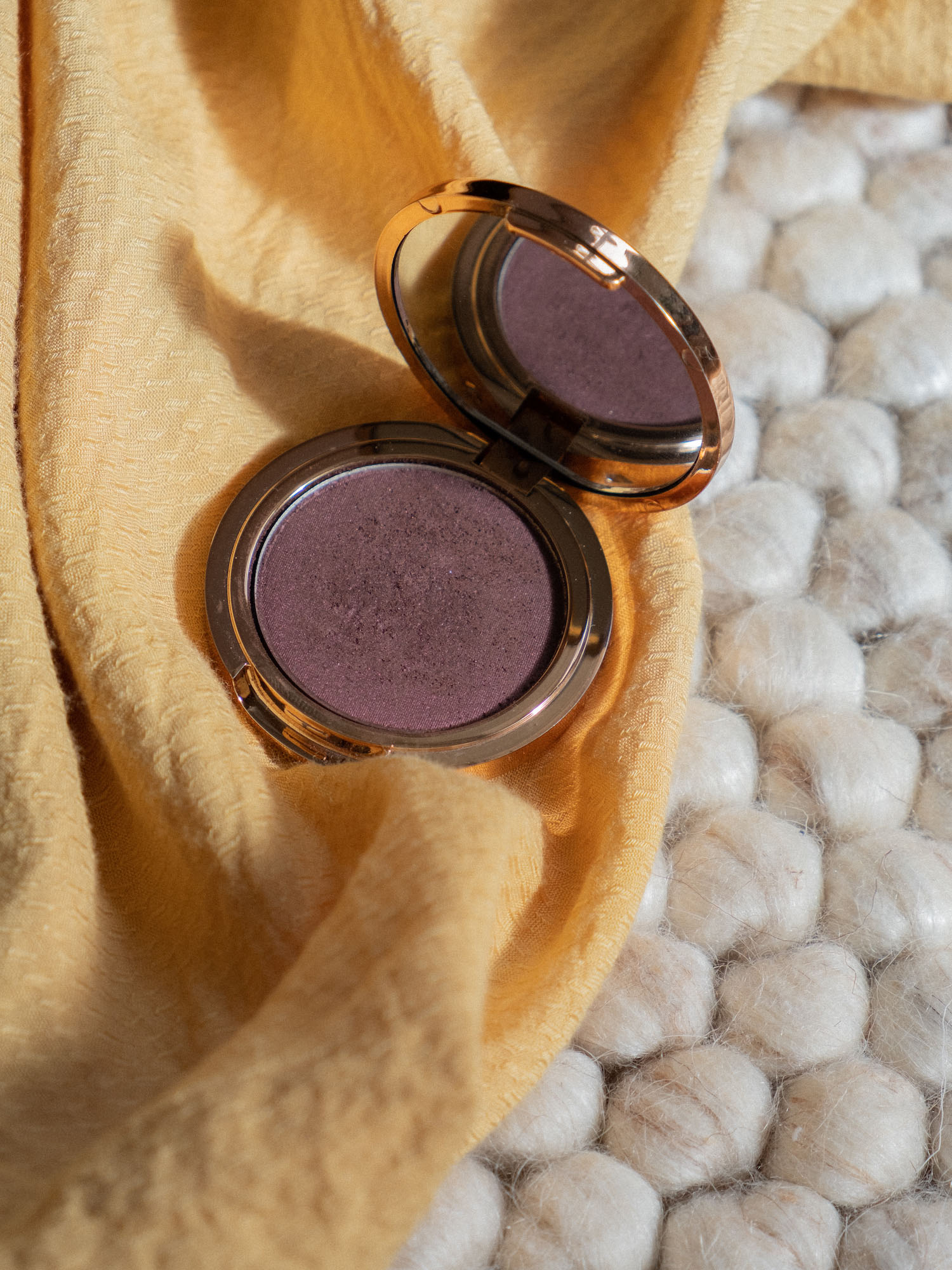 Diesen Look hab ich einfach mit 07 Sunset und viel Mut gemischt. Mehr nicht. Das ganze habe ich auf das bewegliche Lid und natürlich etwas in die Lidfalte mit einem fluffigen Pinsel aufgetragen, es ordentlich verblendet, damit die Kanten etwas weicher werden, und am Ende die Wimpern getuscht. Man sollte vielleicht noch erwähnen, dass vor der Mascara 06 Seashell im inneren Augenwinkel und unter der Augenbraue Platz fand, ein heller Ton, der das Auge öffnet. 07 Sunset, unser Hauptdarsteller bei diesem Look, ist der perfekte Farbton, um ein blaugraues Auge leuchten zu lassen. Ich bin kein Lila-Fan aber Aubergine finde ich gut und ehrlich – das kann auch ein alltagstaugliches Augen-Make-up werden. Es ist intensiv, es ist dunkel, aber es ist nicht schwarz und hart.