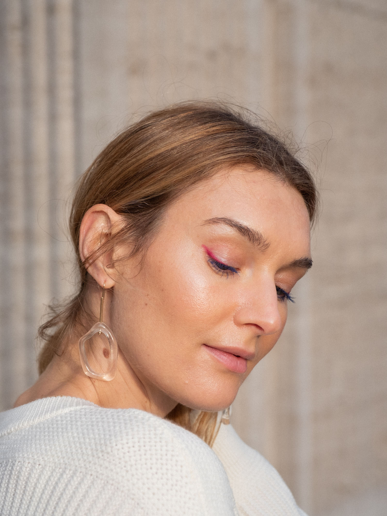 Jegliche bunte Produkte, die mir gerade in die Hände fallen, werden verarbeitet. Und weil es gerade immer trister wird, wurde es im Gesicht etwas bunter: ich habe kurzerhand einen Lipliner als Eyeliner umfunktioniert und mir die Wimpern leicht blau getuscht. Rot oder rötliche bzw. warme Töne lassen blaue und grüne Augen richtig strahlen. Mit der blauen Mascara habe ich meiner natürlichen Augenfarbe, die manchmal einfach eher grau als blau ist, einen kleinen Boost verpasst. Concealer, Foundation, Highlighter und Blush sind wie gehabt. Meine Favoriten kennt ihr ja.