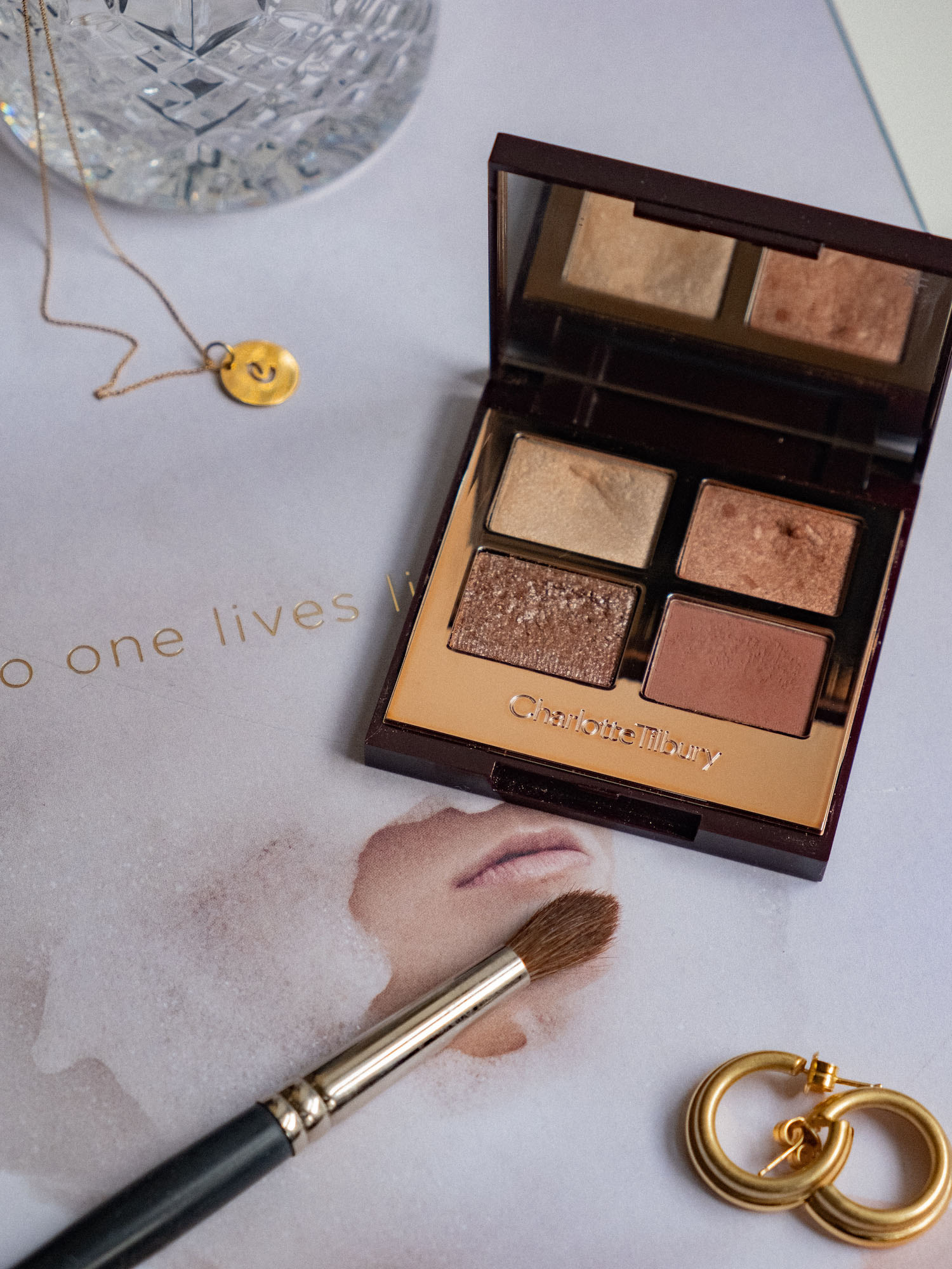 Mit der meistverwendeten Eyeshadow Palette der Queen of Make-up, Charlotte Tilbury kreiere ich diese smokey eyes, die nicht zu düster sind – eher natürlich rauchig für alle die, die sich nicht an die schwarzen, dunkelblauen oder -grünen Farbtöne trauen. Die Bigger Brighter Eyes Filter Palette ist einer meiner Heroes aus dem Jahr 2018. Noch nie habe ich so viele Fragen auf Instastories zu meinem Augen-Make-up bekommen und genau deswegen kann man sie ruhig auch am letzten Tag des Jahres einsetzen. Das gesamte Lid grundiere ich mit der hellsten Farbe aus dem Quad – Prime Prepare (heller Champagner-Ton). Um mein Schlupflid anzuheben, forme ich mehr Tiefe mit Enlarge Agpandit in der Lidfalte und verblende die Übergänge mit einem fluffigen Pinsel. Für mehr Drama – wir wollen ja mehr Drama und deswegen gilt bei diesem Make-up die Devise, mehr ist mehr – füge ich Define Definit dazu. Das ist ein rotbrauner Ton mit ordentlich Wums. Auch hier gilt: blenden und die Kanten in sich verfließen lassen!
