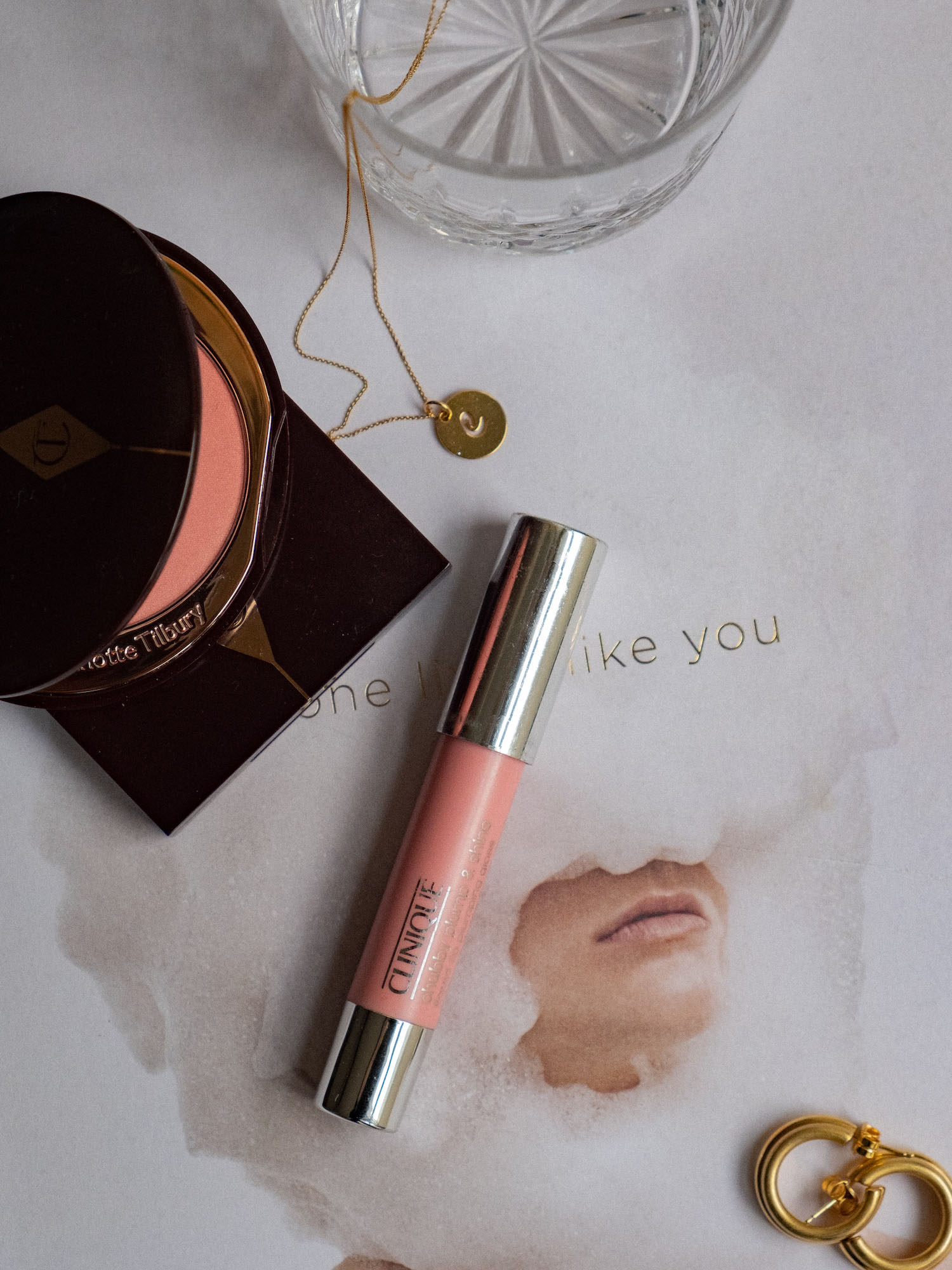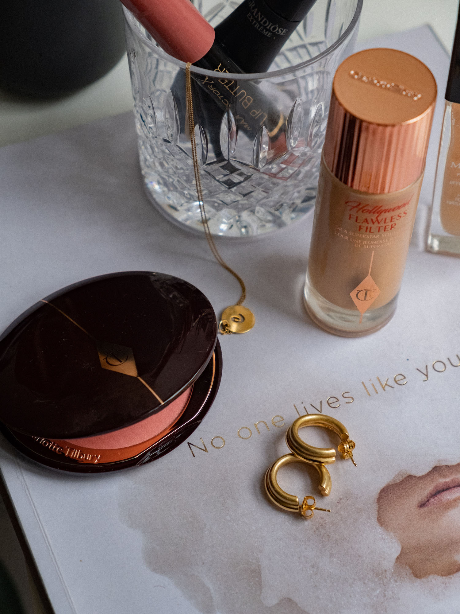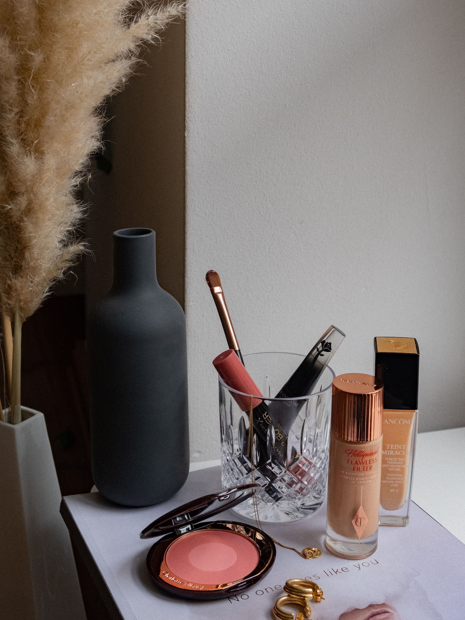Nicht nur in die obere Lidfalte, auch am unteren Wimpernkranz setzte ich mit der Farbe einen Akzent. So, und damit sich niemand benachteiligt fühlt, darf zum Schluss Pop Rehausse (wunderschöner glitzeriger Eyeshadow der gleichen Farbfamilie) sich auf das Lid setzen. Ich tupfe es einfach leicht mit einem Pinsel auf, weil die Partikel doch recht grob sind und durch das Wischen des Pinsels sonst nur im ganzen Gesicht verstreut werden. Um den oberen Wimpernkranz zu verdichten, male ich einen Lidstrich mit dem The Feline Flick Liquid Eye Pen ebenfalls von Charlotte Tilbury und verwische ihn sofort, da ich keine Kanten, sondern eher rauchige Schatten haben will. Um das Drama auf dem Auge abzuschließen, tusche ich die Wimpern mit der gehypten Limitless Lash Mascara von Ilia. Noch Lipgloss auf die Lippen und schon kann der Abend beginnen.